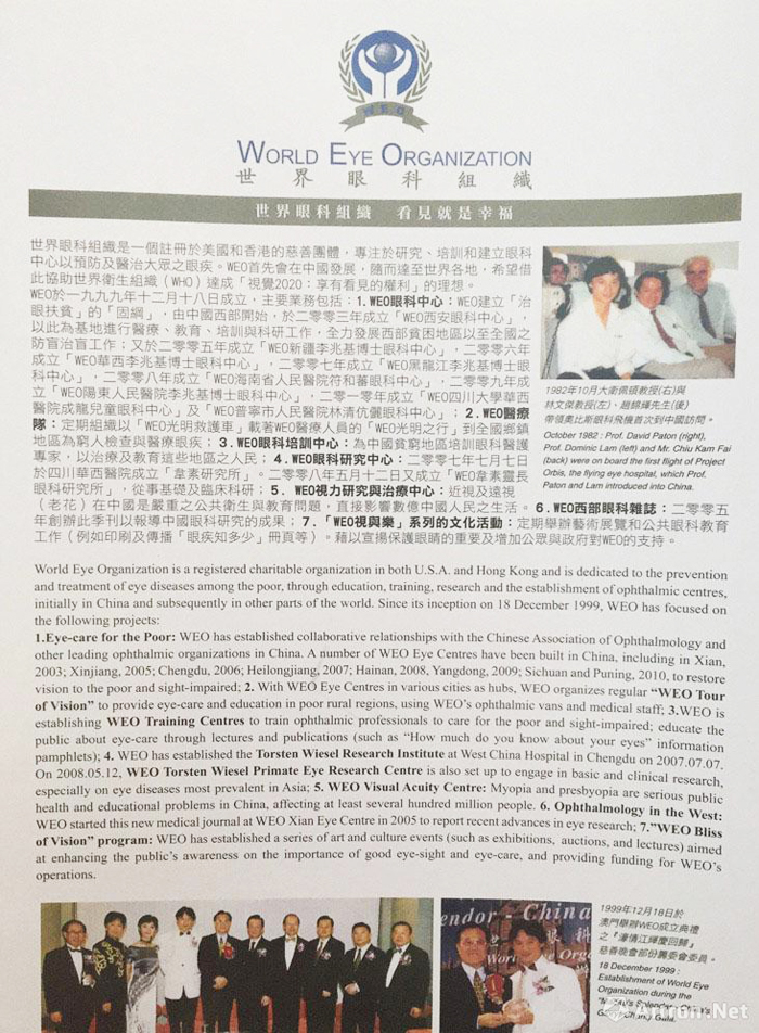 l 2003年9月8日建立WEO「西安眼科中心」,主旨在帮助中国西北部贫穷地区的失明人士。