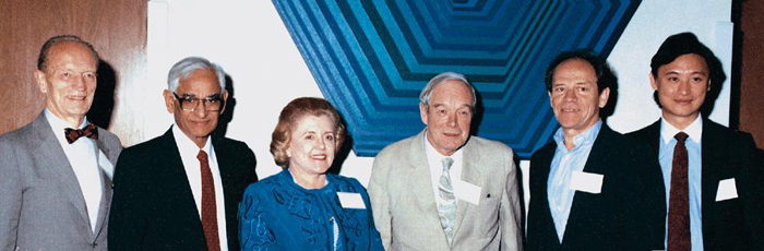 林文傑教授(右一)在视网膜研究研讨会,特别邀请美国休斯敦州长卫嘉芙•卫美 Kathy Whitmire(左三)及其先生Jim Whitmire(左一)和三位诺贝尔得奖者莅临,英国剑桥大学的亚伦•劳埃德霍奇金爵士 Sir Alan Hodgkin(右三)、美国麻省理工学院的高宾•哥伦拿教授Gobind Khorana(左二)及瑞典卡罗林学院杜斯顿•韦素教授Torsten Wiesel(右二)。