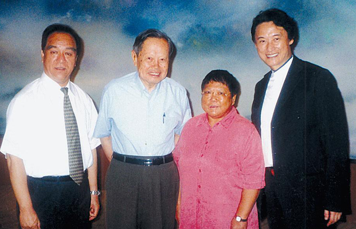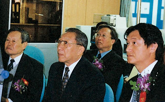 1999年10月2日林文傑教授(右一)和杨振宁教授(左一)李岚清副总理(左二)一起祝贺清华大学高等研究所的落成。