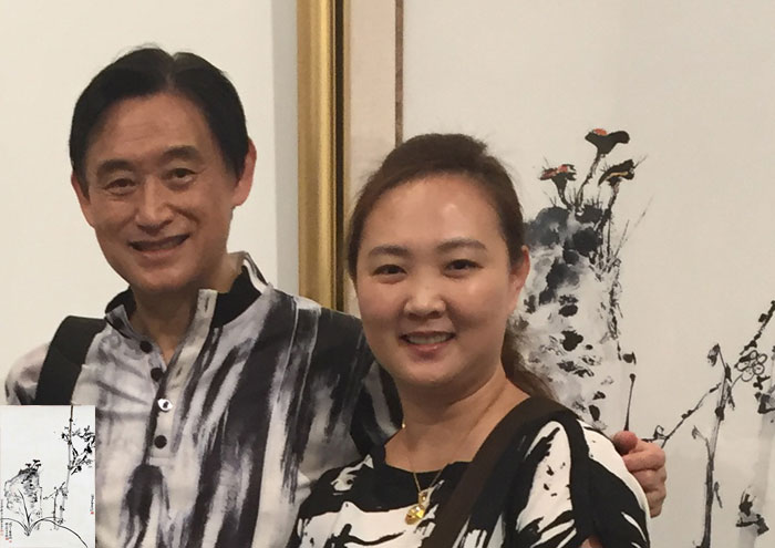 林文傑教授与"世界文化艺术联合总会"署理总会长丁峻女士在其近代四大名家合作创作之《梅兰竹芝》前畄影