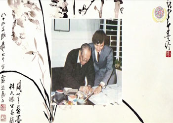 忆起张大千这国画大师, 林教授有一幅跟他和赵少昂、关山月合作的珍藏《梅兰竹芝图》。那幅画是林教授在82年12月去广州关山月家中做客,当时适逢中英谈判香港回归, 觉得大中华本是一家,就构思请中、港、台最重要的画家合作画一幅传世作品。林教授当时虽不是大名家,但乐意做一个穿针引线的使者,所以他先画兰花,关山月画梅、赵少昂画竹、张大千再补灵芝和寿石。